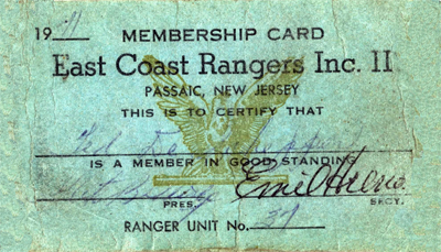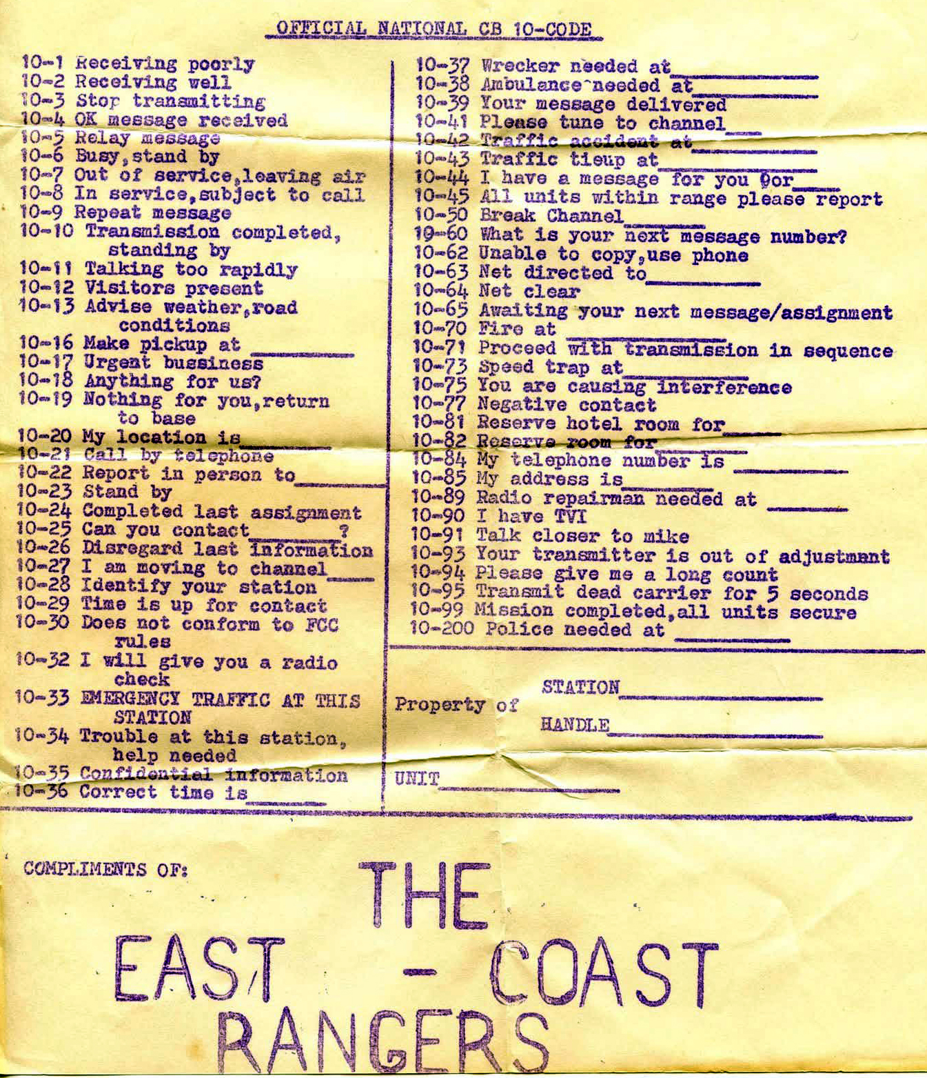 Introduction The East Coast Rangers was an organization designed to help people in need of assistance. The organization was formed around 1970 with many people joining from CB and Ham radio. Meetings were held on a regular basis as more and more members were recruited. Bandit (AL B.) was the first president of the organization and lead all of the meetings. At first the club really had no specific purpose until members such as Elliot Ness and Shadow 7 suggested that the club should focus on helping people in emergency situations. The vote was unanimous and the club would begin assisting people as needed. East Coast Membership Certificates and CB 10 Code List (Click image to enlarge)